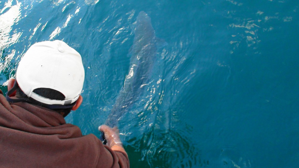 PAT FORD CAME BACK TO PUMA II TO GO TO THE BATHROOM-CHEF LUIS TOLD HIM THERE WAS A BIG FISH BESIDE THE MOTHERSHIP