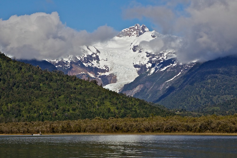 FISHING A RUN ON THE YELCHO RIVER WITH THE HANGING GLACIER IN THE BACKGROUND