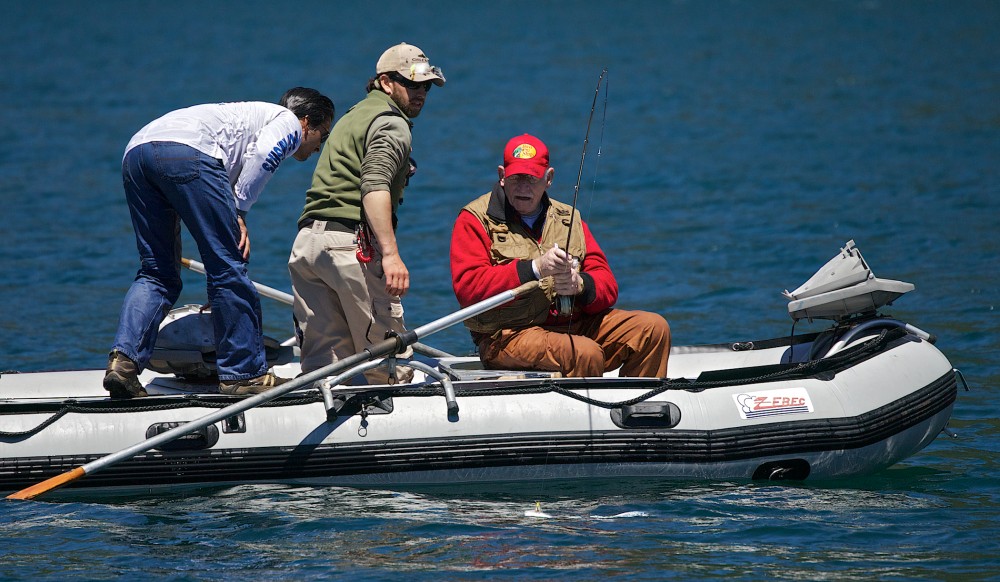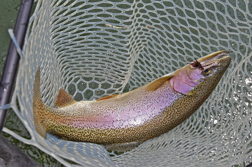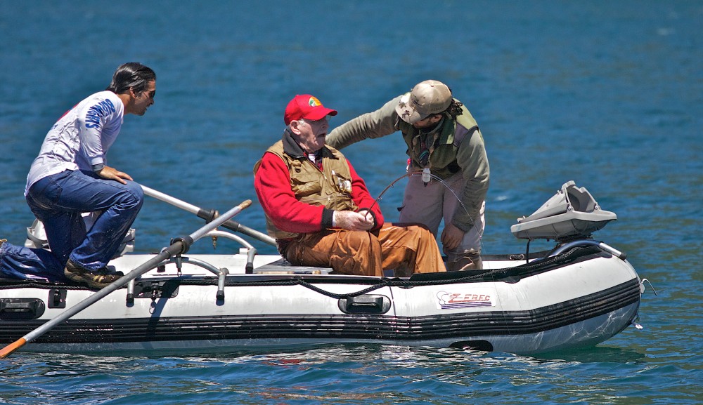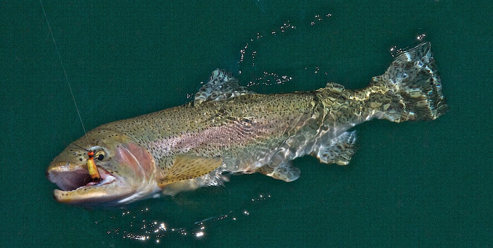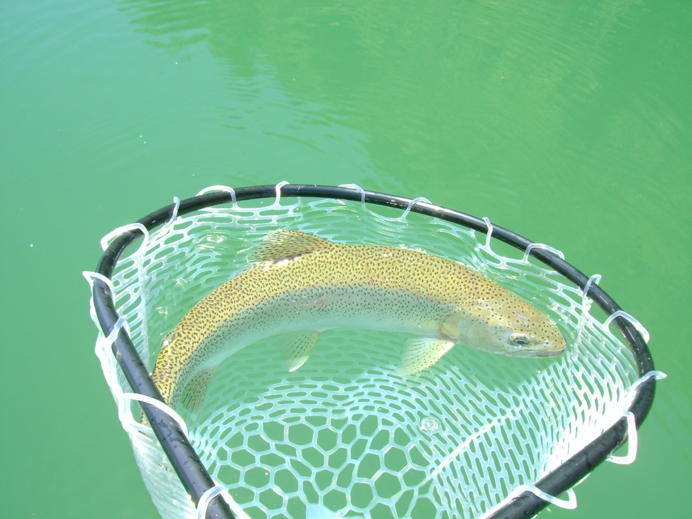 SWIMS WITH RAINBOWS (CAPTAIN BILL CURTIS)BRINGING TROUT TO THE BOAT