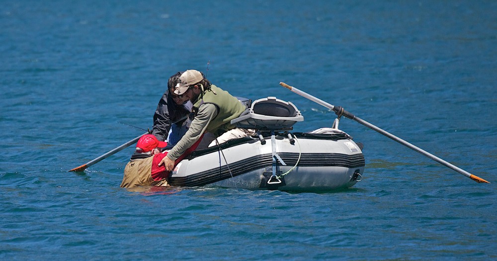 SWIMS WITH RAINBOWS (CAPTAIN BILL CURTIS)-BILL AND PABLO GETTING BACK IN THE BOAT