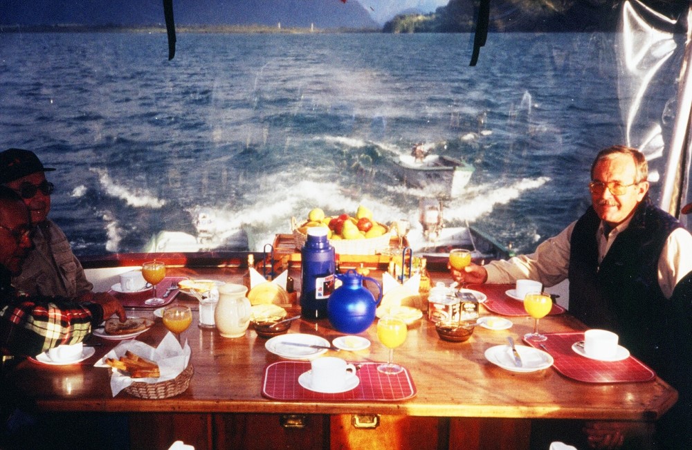 BREAKFAST ON PUMA I -NOTE SKIFFS BEING TOWED BEHIND