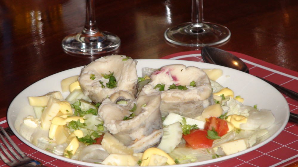 PUMA II DINING AREA SET WITH KING CRAB APPETIZERS -- NOTE THE SKIFFS BEING TOWED BEHIND